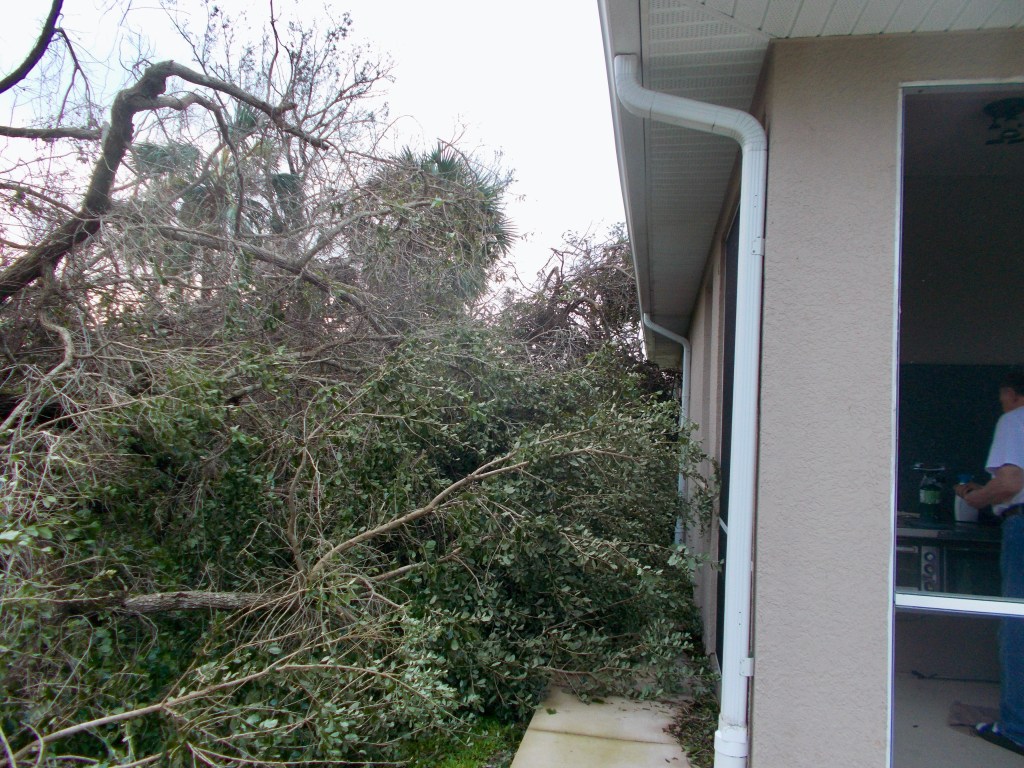 Downed trees from the vacant wooded lot next door blew against our house.Tops of fallen trees against the window.