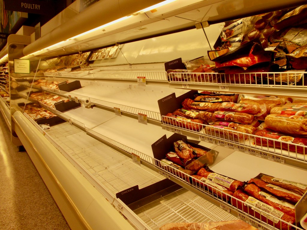 Meat department of a grocery store. On a couple of days, they ran out of ice. One day I shopped there, and they were out of milk. Today they were out of eggs and sour cream. In the first few days after the storm, there were lines outside of some grocery stores.