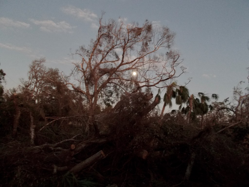 Moonrise over the remains of trees that blew over against our windows during Hurricane Ian. Friday, 10/7/22. We have a crew coming this week to cut up the branches and carry them to the street for FEMA to pick up.