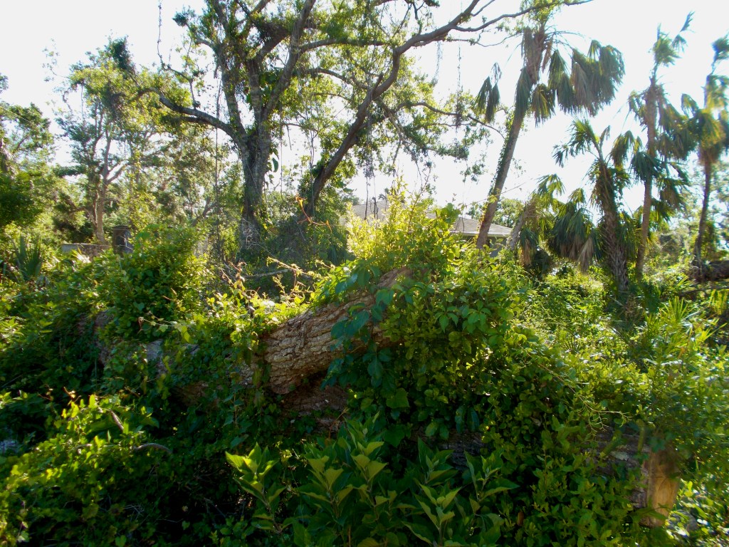 Vacant wooded lot next to our house before Hurricane Ian. Live oaks and native cabbage palms grew there. Purple Ruellia, probably planted by a homeowner twenty years ago, grew naturalized along the edge of the woods.