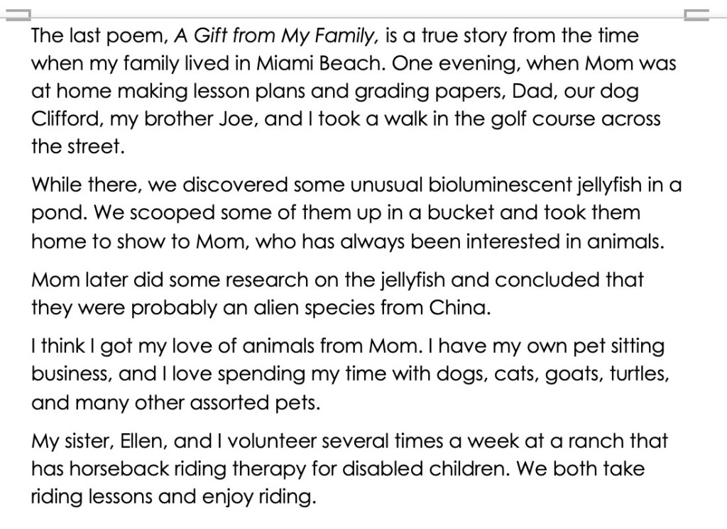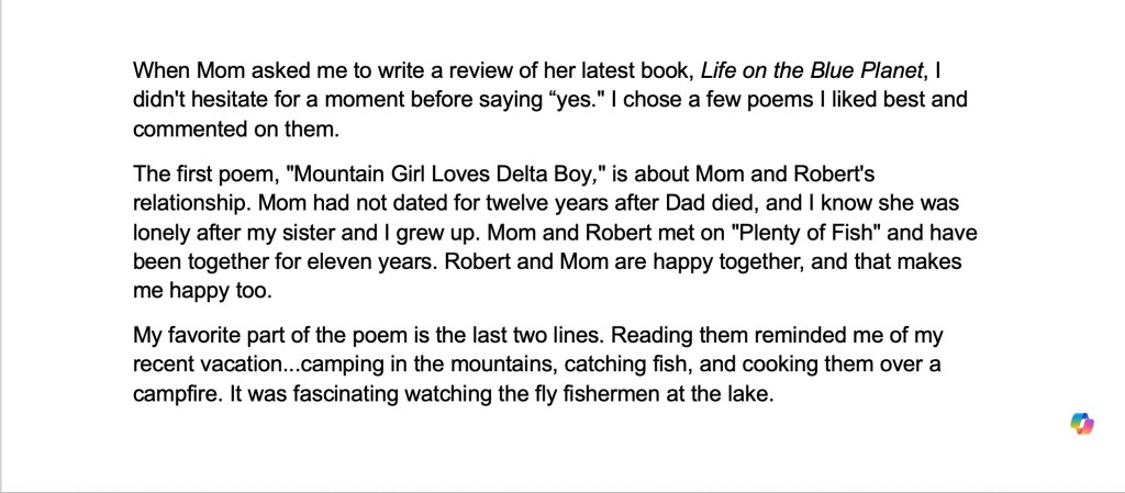 This is the third of these “representative reviews” generously provided by my family that I have posted on WordPress. I will post more of these over time.