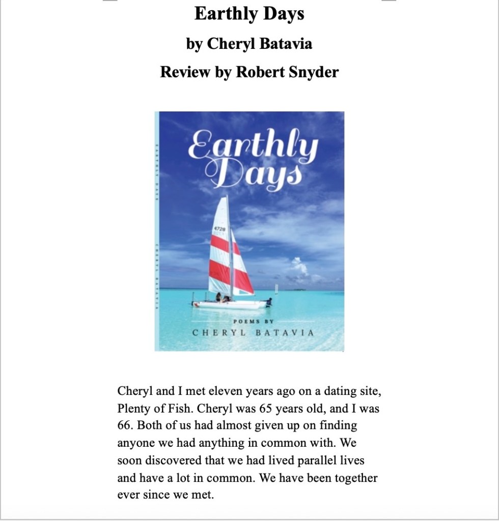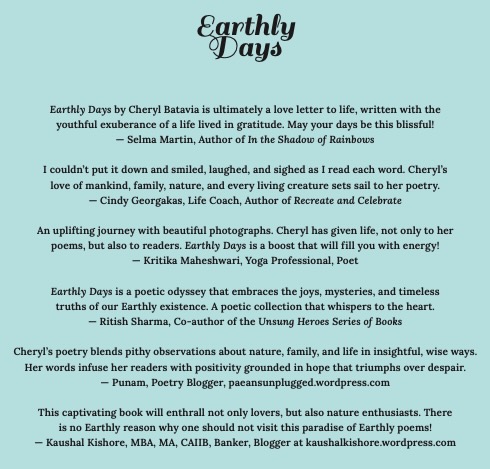 Before I published Earthly Days, several of my fellow bloggers agreed to do advance reviews. Excerpts from those reviews appear on the back cover of Earthly Days.