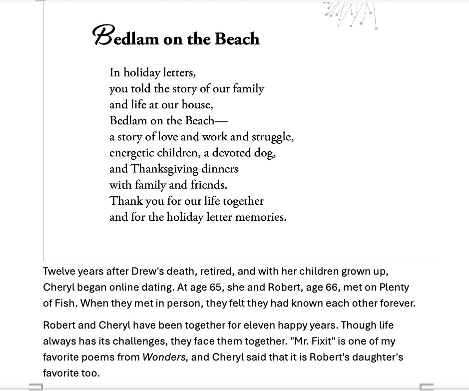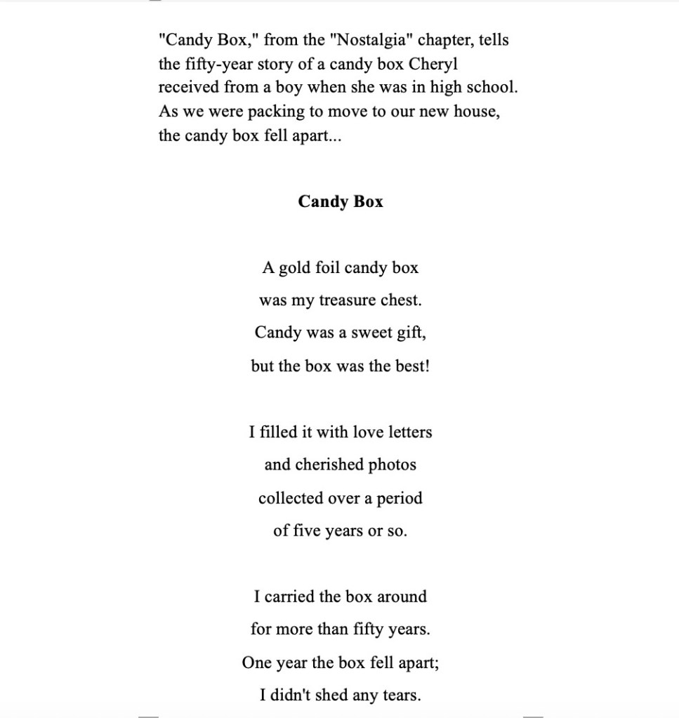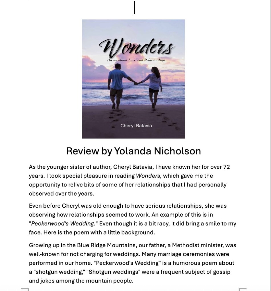 Wonders: Poems about Love and Relationships was my first book. It is a tribute to the wonderful, though very different, men I have known and loved. There is a chapter of poems written for each individual man.