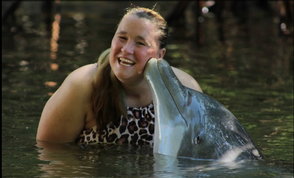 Katey Gets a Kiss from Skipper, the Dolphin, at Theater of the Sea, Islamorada, Florida.