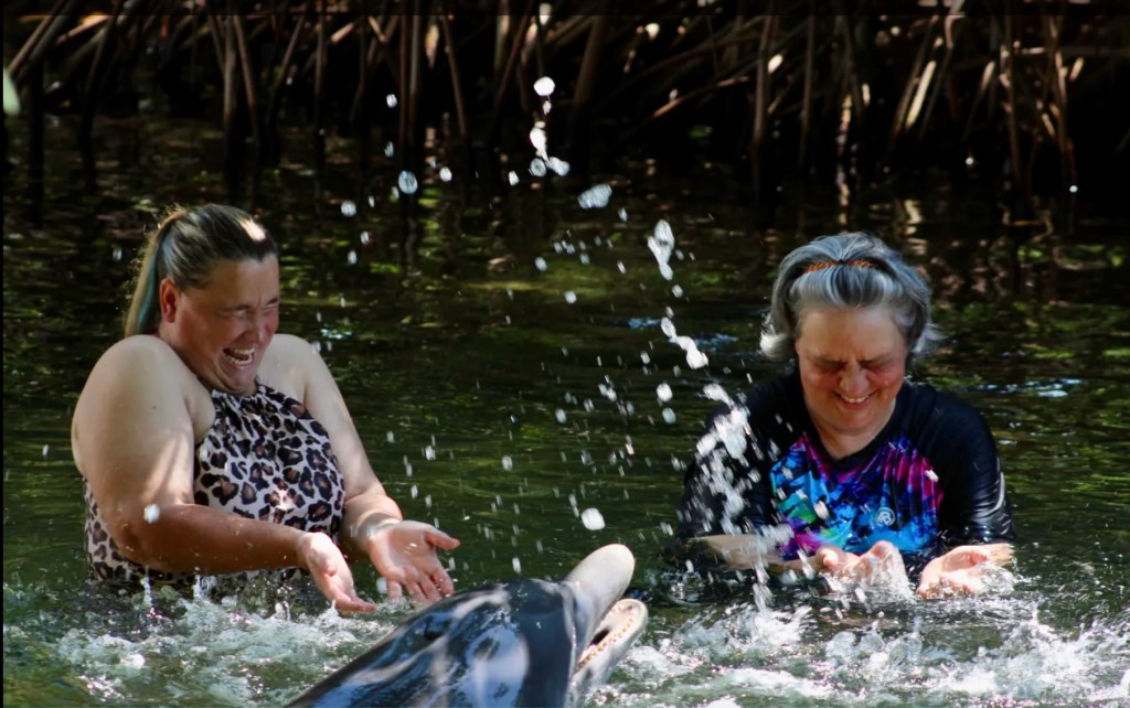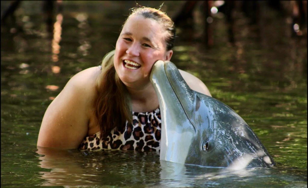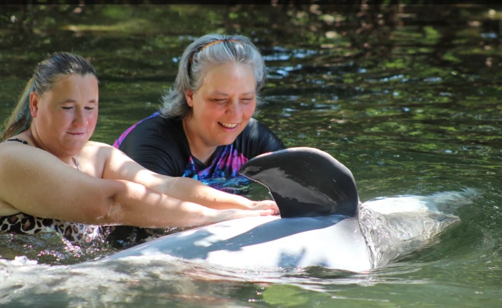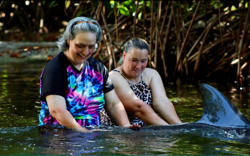 (Cheryl Batavia’s daughters, Ellen and Katey, meet Skipper, the bottle-nosed dolphin, and his trainer.)