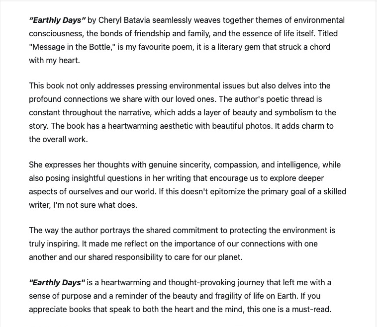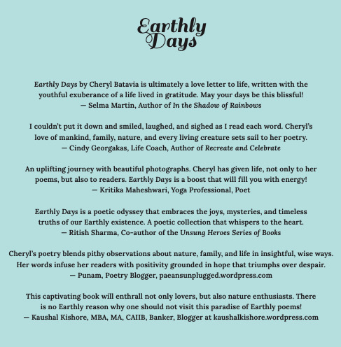 Earthly Days, poems by Cheryl Batavia, is ultimately a love letter to life, a testament written with the youthful exuberance of a life lived in gratitude. I concur that nothing is as beautiful as arriving at retirement and looking back at life with such a grateful heart.